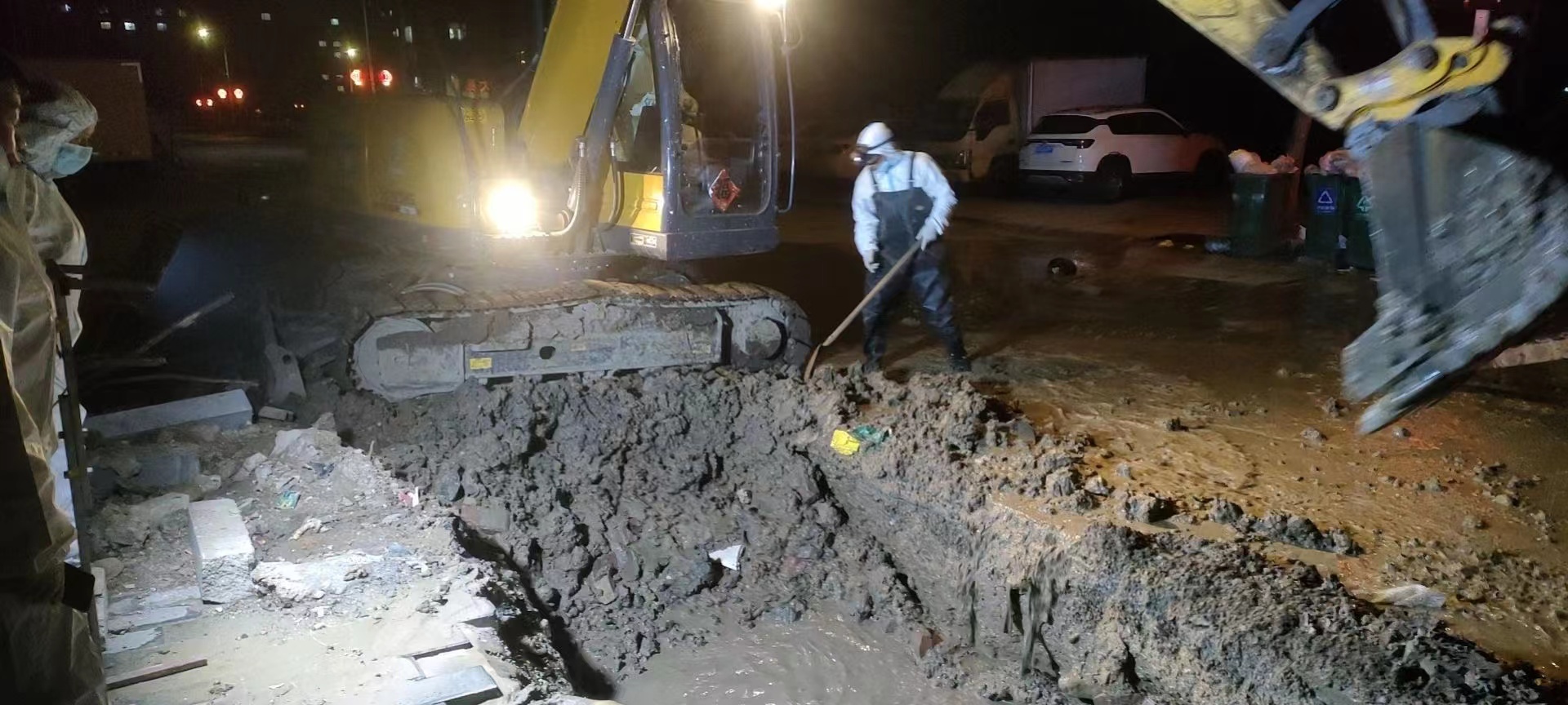 3月15日晚9點多,鲅魚圈分公司接到宋屯小區(qū)物業(yè)的求助電話,小區(qū)內主路有大量積水,疑是自來水管道漏水,宋屯小區(qū)全部停水,分公司維修隊全體成員在隊長唐有的帶領下,迅速做好個人防護,對人員和設備及材料進行消殺后,第一時間奔赴漏水現(xiàn)場。經(jīng)詳實探查發(fā)現(xiàn)是通往宋屯小區(qū)的供水DN900mm主管道管網(wǎng)漏水,現(xiàn)場電、氣、通訊等各條線路縱橫交錯,給搶修工作帶來巨大不便,唐有和隊員們迎難而上,在零下10多度的低溫下輪流上陣,用鐵鍬一點一點掏挖出操作空間。厚重的防護服、護目鏡等防護用具使搶修人員們的動作顯得有些笨拙,憑借著豐富的搶修經(jīng)驗,夜里12時許將漏點挖出,直至凌晨1點半,恢復了宋屯小區(qū)的正常供水。